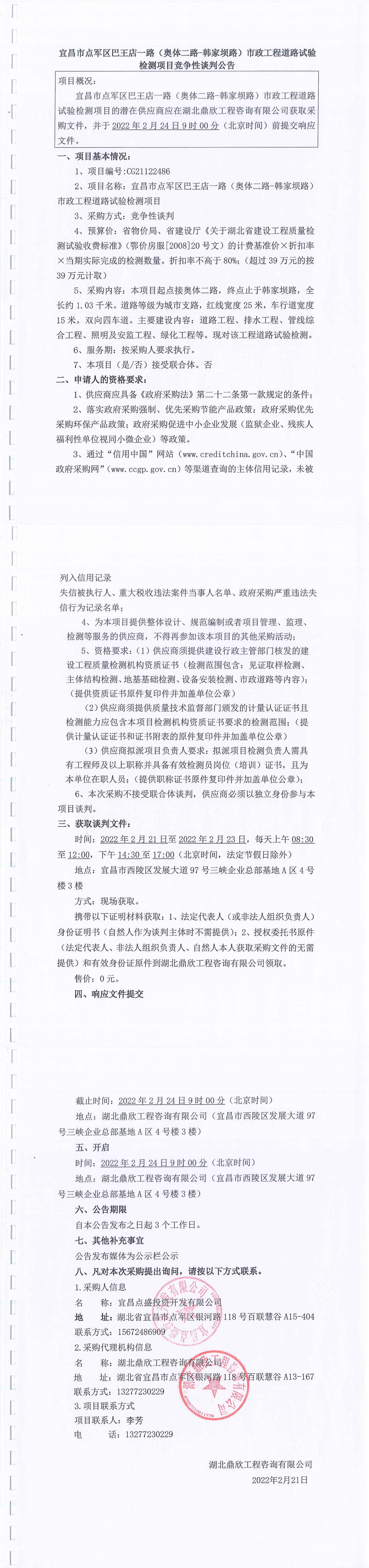 宜昌市點(diǎn)軍區(qū)巴王店一路(奧體二路-韓家壩路)市政工程道路試驗(yàn)檢測項(xiàng)目談判公告
