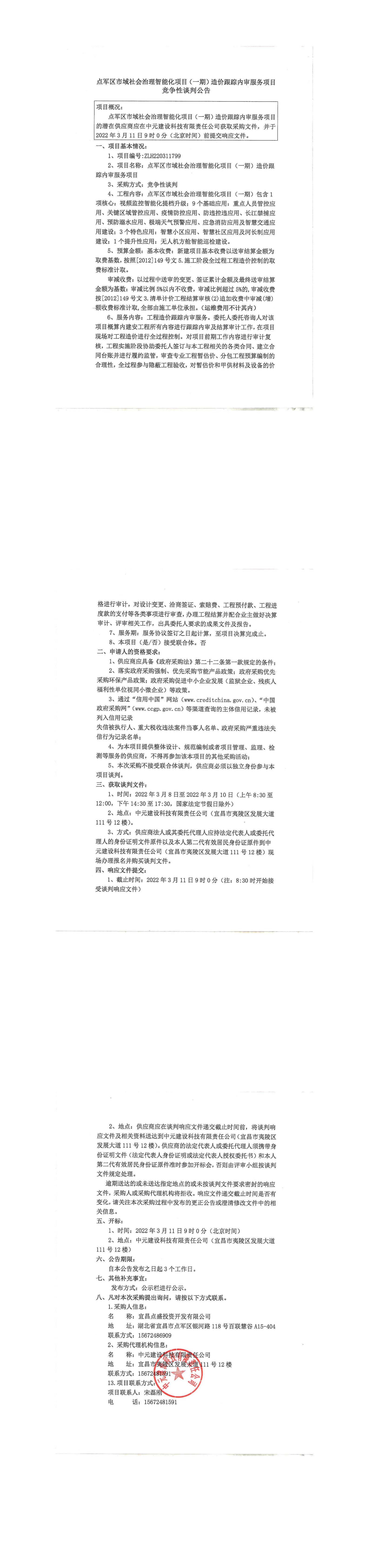 點軍區(qū)市域社會治理智能化項目(一期)造價跟蹤內審服務項目談判公告