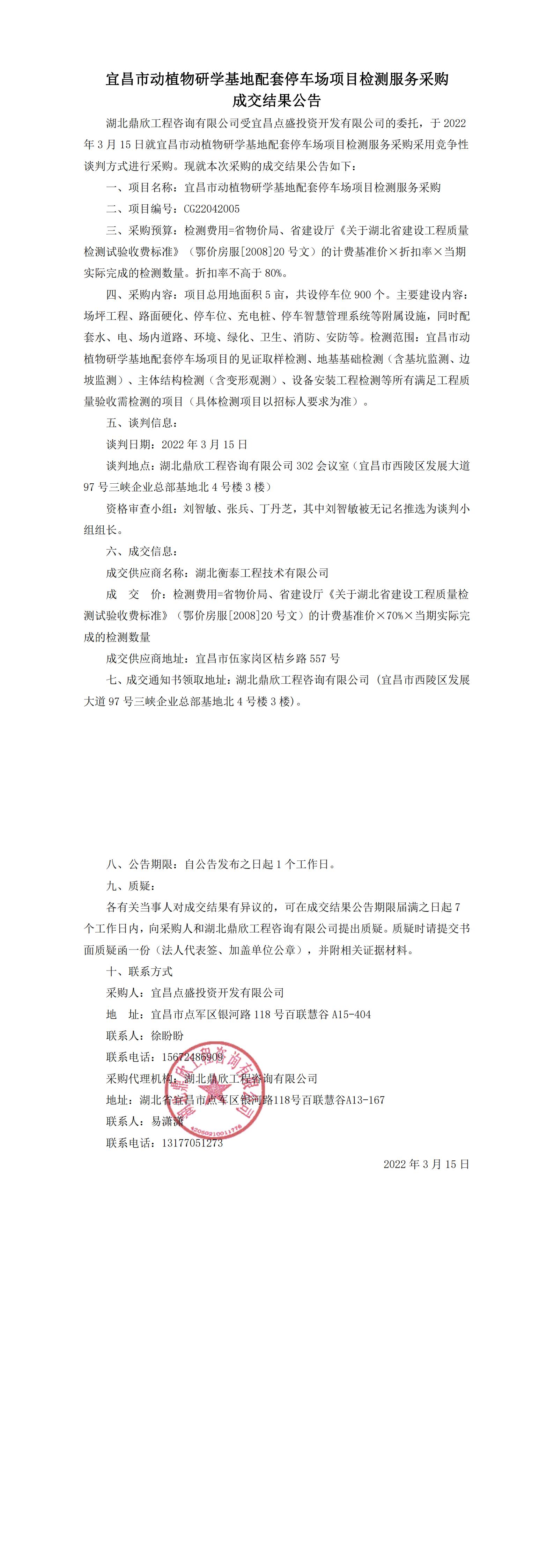 宜昌市動植物研學基地配套停車場檢測服務采購成交結(jié)果公告