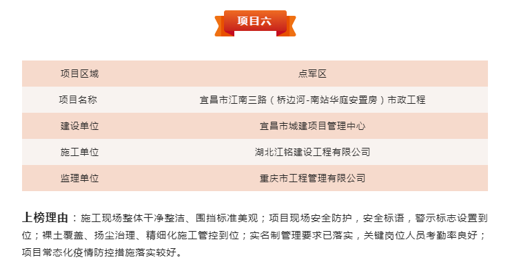 (通訊員:徐文剛、吳鵬翔)為進一步貫徹落實《宜昌市揚塵污染防治條例》《宜昌市城區(qū)建設工程文明施工管理紅黑榜制度(試行)》,強化建筑工地文明施工管理,壓實建設單位文明施工主體責任,鼓勵文明施工先進典型,打擊和曝光不文明施工違法行為,結(jié)合建筑工地實名制管理、關(guān)鍵崗位人員到崗履職相關(guān)要求,宜昌市住建局組織評選了2022年第七期建筑工程安全文明施工管理“紅黑榜”。點盛投資開發(fā)有限公司代建項目江南三路,成為點軍區(qū)唯一獲評紅榜的市政項目。