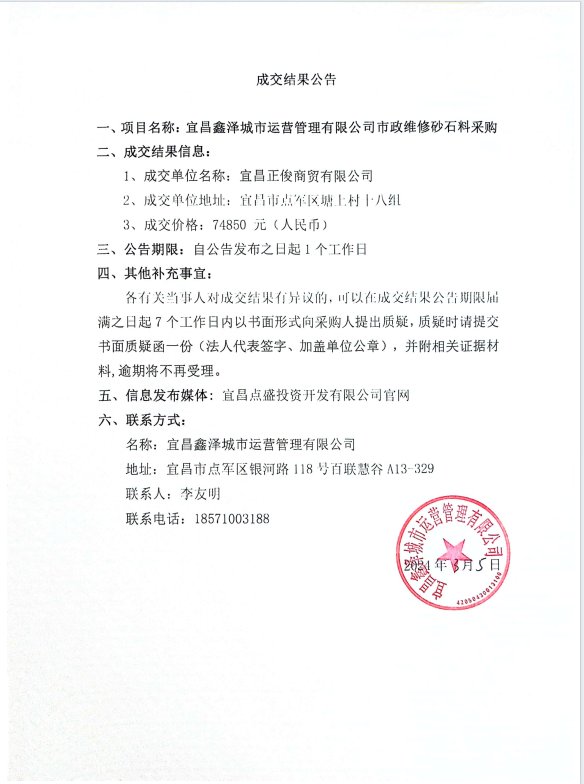 宜昌鑫澤城市運(yùn)營(yíng)管理有限公司市政維修砂石料采購(gòu)項(xiàng)目成交公告