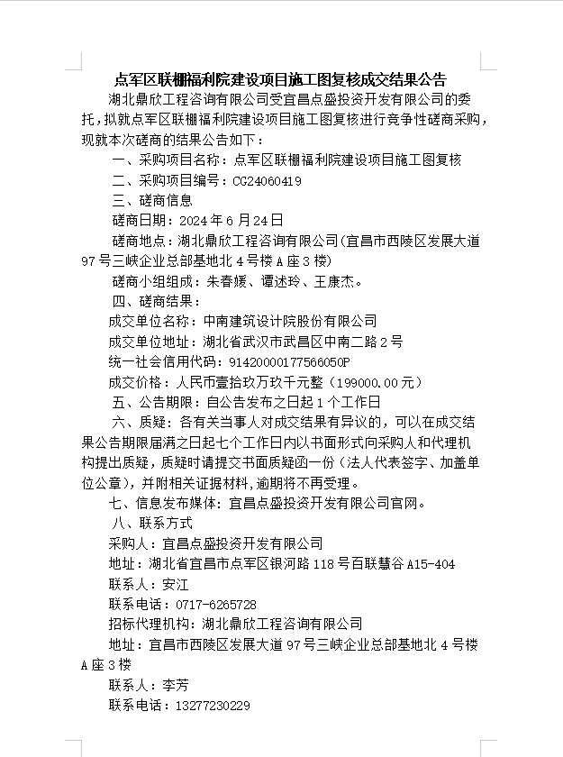 點軍區(qū)聯(lián)棚福利院建設(shè)項目施工圖復核成交結(jié)果公告