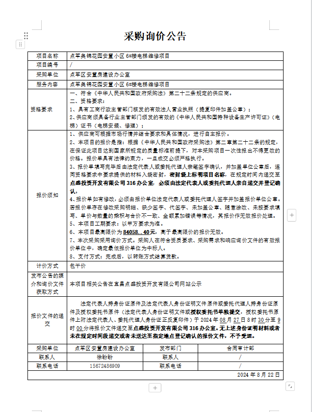點(diǎn)軍奧錦花園安置小區(qū)6#樓電梯維修項(xiàng)目詢價(jià)公告