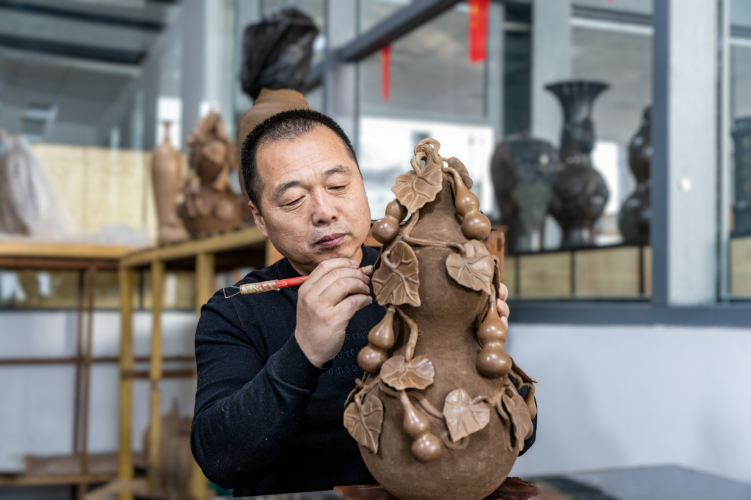 黑陶是華夏先民的黑色詩篇,作為土生土長的濟(jì)陽人,三十余載光陰里,徐慶增潛心研究黑陶,續(xù)寫這光輝的詩篇。如今,他的作品早已超越實(shí)用范疇,成為兼具藝術(shù)價(jià)值與文化厚度的非遺名片?!洱堯v盛世》以華夏龍為魂,將泥與火的淬煉推向極致?!陡酆J》造型圓潤飽滿,釉色沉郁如墨玉,無需多言,一抹玄色間,福氣已悄然落定?!豆淖友砀琛穭t將田間地頭的歡騰瞬間凝固于陶面,讓人仿佛聽見咚咚的鼓點(diǎn),看見祖輩們在黃河邊舞出的煙火人間。這些凝聚著心血的創(chuàng)作,不僅是他個(gè)人的藝術(shù)成就,更成為高校非遺教學(xué)中鮮活的教材。